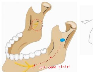 Alt çene kemiðinin içerisinde yer alan sinir , çene kemiðinin arka bölgesinden , çene kemiði içerisine girererek , küçük azý diþleri bölgesine kadar , kemik içerisinde devam eder . Bu sinir , küçük azý diþler bölgesinde , kemik içerisinden çýkarak , yumuþak dokudan devam eder . Sinir , alt çenenin ön orta bölümünde sonlanýr . Alt çene siniri , alt çenedeki diþlerin ve alt dudaðýn ortasýna kadar olan bölümün kontrolünü saðlar . Bu sinirin önemi ise ; implant ameliyatýnda , gömülü diþ ameliyatýnda , apikal rezeksiyonda , alveoler distraksiyon ve ortognatik cerrahileri esnasýnda , sinire herhangi bir zarar verilirse , geçiçi veya kalýcý uyuþmaya neden olnuur .